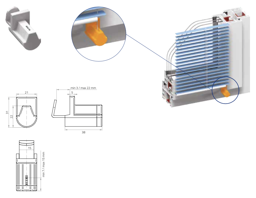 Kies dan voor de kiep-kantel klem. Onderstaand de afmetingen van de klem.Zijgeleiding staaldraad is optioneelMogelijk voor standaard ramen & kiep-kantel ramen. Zijgeleiding (aan beide zijde) door middel van staaldraad houdt het jaloezie netjes op zijn plaatst houdt. Vaak gekozen bij kiep-kantel ramen of als u het product strak & netjes op zijn plaats wil houden. Voorbeeld:Ondersteun zijgeleiding vensterbankenDe ondersteun voor vensterbanken. Montage met schroef.