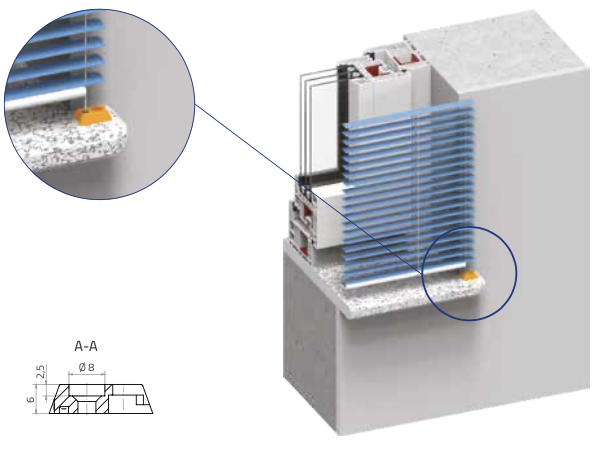 Zijgeleiding staaldraad is optioneelMogelijk voor standaard ramen & kiep-kantel ramen. Zijgeleiding (aan beide zijde) door middel van staaldraad houdt het jaloezie netjes op zijn plaatst houdt. Vaak gekozen bij kiep-kantel ramen of als u het product strak & netjes op zijn plaats wil houden. Voorbeeld:Ondersteun zijgelegeleiding vensterbankenDe ondersteun voor vensterbanken. Montage met schroef.