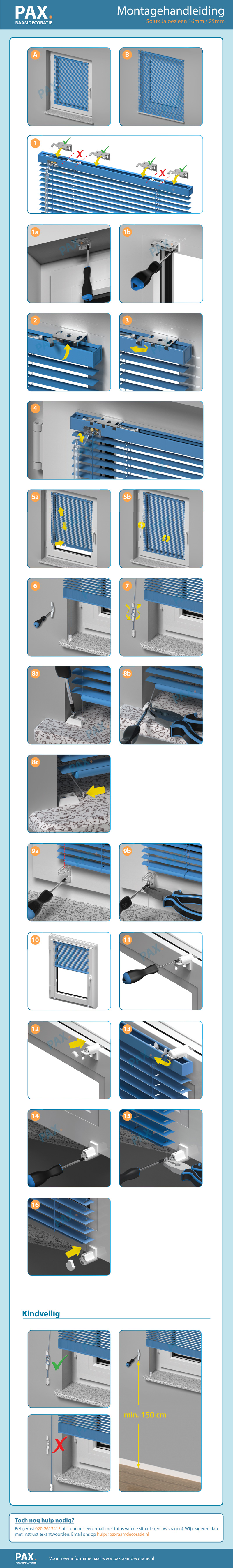 Deze aluminium jaloezieen worden op maat gemaakt tot maximaal 200cm breed & 200cm hoog. Voor standaard ramen tot 200cm de beste kwaliteit optie binnen onze "premium collection". Te monteren met standaard systeem (schaarsteun / wandsteun) of speciale kiepkantel klem. Bij gebruik van de klem hoeft u dus niet te boren (gebruikersgemak & eenvoudig monteren). In meer dan 30 populaire kleuren. Top kwaliteit - Solux®