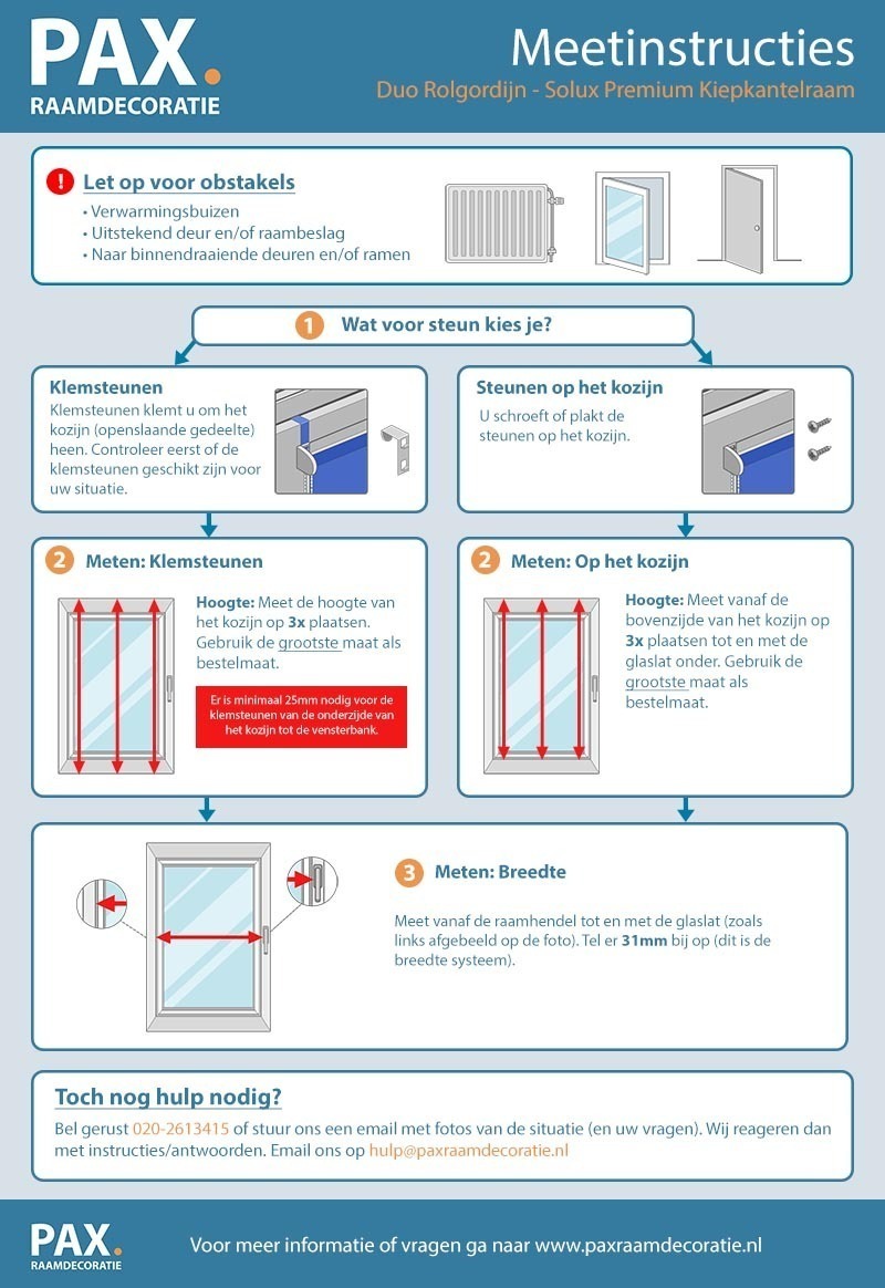 De rolgordijnen kunnen 300 mm tot en met 1500 mm breed worden geproduceerd. De hoogte kan 300 mm tot en met 2300 mm worden geproduceerd. De maximale hoogte is mede afhankelijk van de gekozen breedte en kan daarnaast per stof verschillen, als u met de muis over de stof beweegt dan ziet u de maximale hoogte staan.