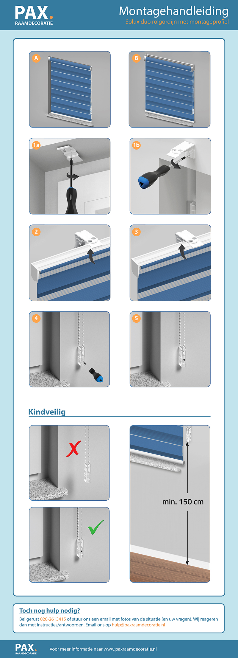 Een montageprofiel is makkelijk te monteren en u bepaalt zelf waar de steunen komen. U kunt door de dubbele stof met de lichtinval spelen net als bij horizontale jaloezieen. U kunt een duorolgordijn van boven naar beneden bedienen met een ketting en de linchtinval bepalen door het rolgordijn in drie standen te zetten: open, half open en gesloten stand.