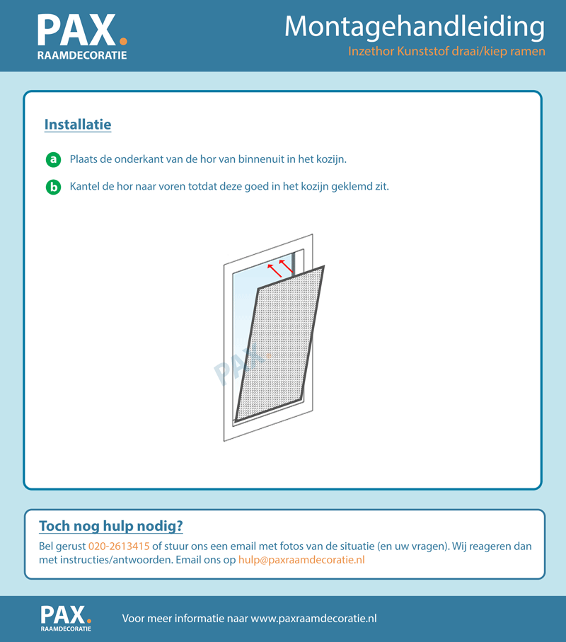 Dit product is specifiek gemaakt voor draai-kiepramen. Bij naar binnen draaiende ramen (die niet kunnen kiepen) kan een inzethor wel geplaatst worden, maar dan bestaat de kans dat uw raam niet meer dichtgaat. U moet de hor dan uit het kozijn halen als u het raam wilt sluiten. Een andere mogelijkheid kan een rolhor zijn die u buiten tussen het kozijn plaatst.