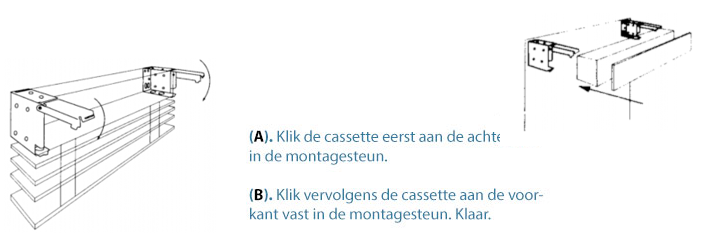 - Bij 25mm / 35mm lamellen is het ophangsysteem 50mm diep & 49mm hoog. De cassette zelf is iets kleiner 42mm diep & 42mm hoog.
