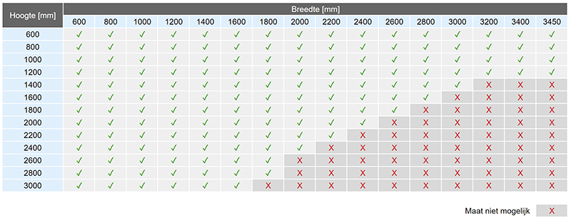 Bij een te grootte breedte i.c.m. hoogtemaat wordt het totaal gewicht te zwaar van de houten jaloezieen. Daarom zijn er bepaalde breedte Icm hoogte maten die niet mogelijk zijn.