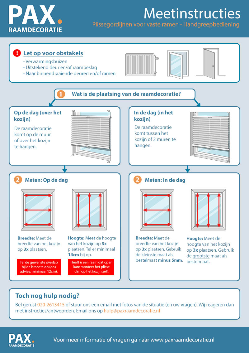 Het inmeten is simpel & eenvoudig. Bekijk de instructies hieronder. Meer technische informatie van dit product is te vinden onder het tabje "techische informatie". Deze inmeethandleidingen geldt ook voor dag-en-nacht plissegordijnen. Wij hebben twee handleidingen (type ramen):