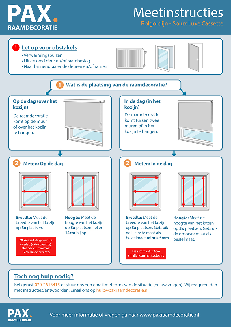 De rolgordijnen kunnen 300 mm tot en met 2200 mm breed worden geproduceerd. De hoogte kan 300 mm tot en met 3000 mm worden geproduceerd. De maximale hoogte kan per stof verschillen, als u met de muis over de stof beweegt dan ziet u de maximale hoogte staan. De minimale en maximale afmetingen kunnen ook per bediening verschillen.