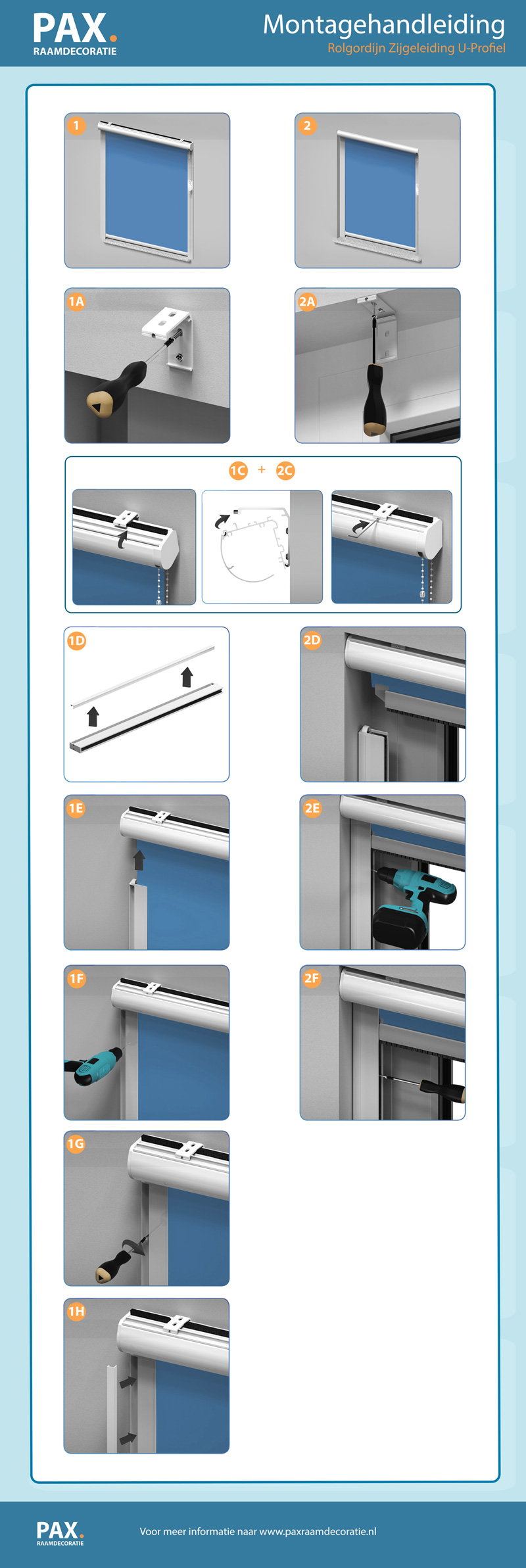 U krijgt universele bevestiging voor zowel wand als plafond montage. Deze steunen dient u door middel van schroeven te bevestigen. De u-profielen dient u ook met schroeven te bevestigen op de muur of kozijn. Het u-profiel bestaat uit 2 delen, een u-profiel en een afdekprofiel zodat de montage niet zichtbaar is.
