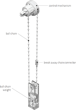 U kunt kiezen voor ketting als bediening. U kunt daarbij nog kiezen uit een kunststof ketting of een metalen ketting. De kunststof ketting wordt geleverd in de gekozen systeemkleur en de metalen ketting is zilver. Er geldt een meerprijs voor de metalen ketting. U kunt zelf bepalen aan welke kant de bediening komt.