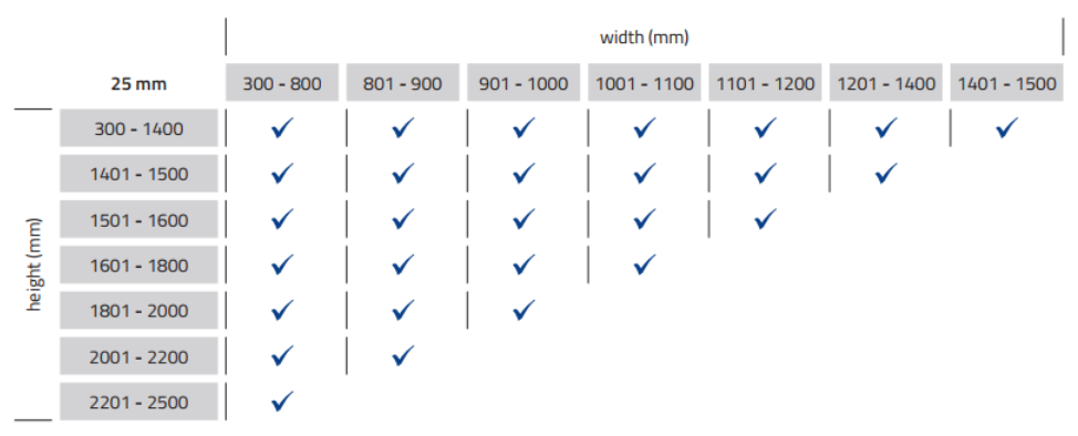Afhankelijk van de breedte en hoogte zijn er beperkingen in mogelijke maten.