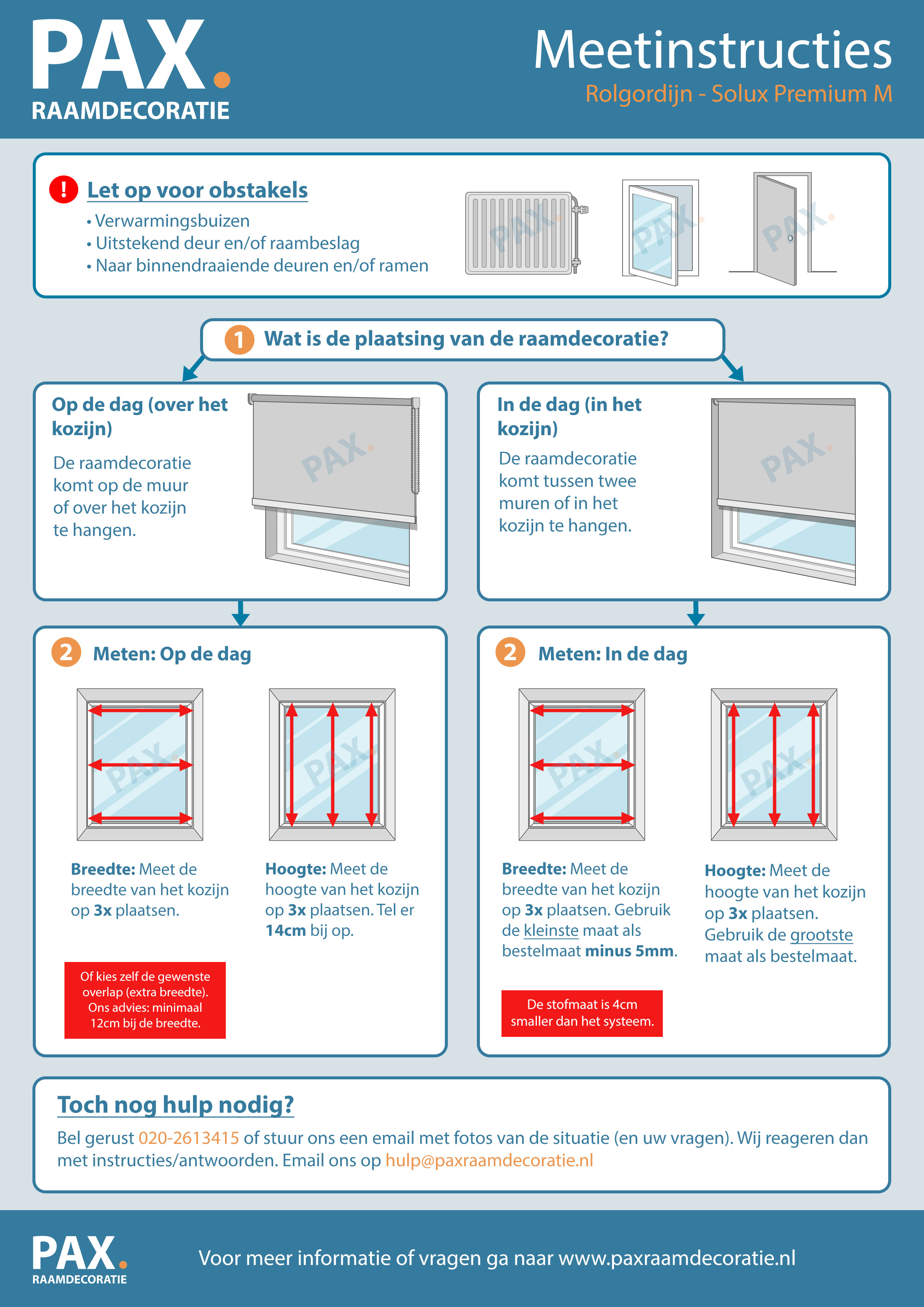 De rolgordijnen kunnen 300 mm tot en met 3500 mm breed worden geproduceerd. De hoogte kan 1000 mm tot en met 5000 mm worden geproduceerd.